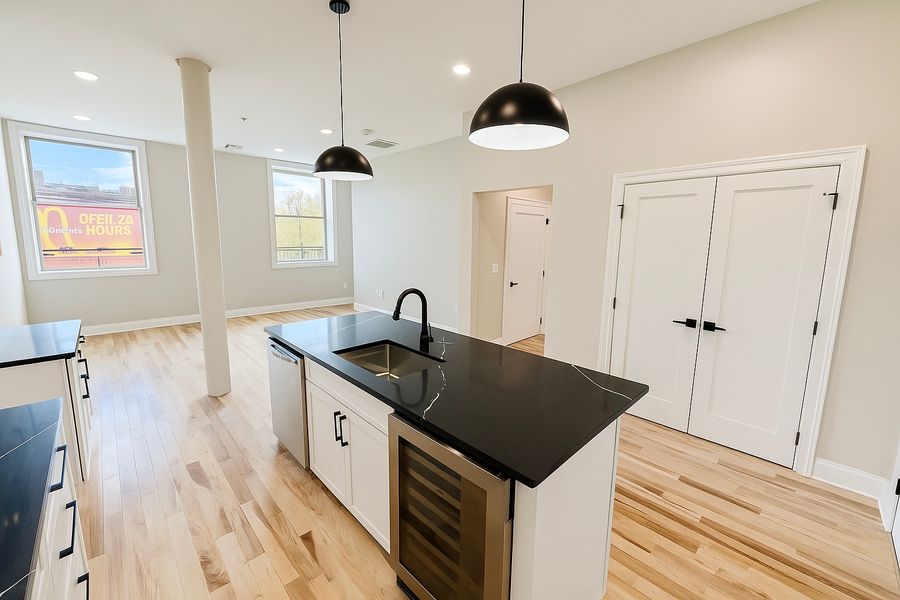 The kitchen offers white cabinetry with black hardware, black quartz countertops, and a sleek center island equipped with a sink, dishwasher, and built-in wine cooler—perfect for entertaining or everyday living.